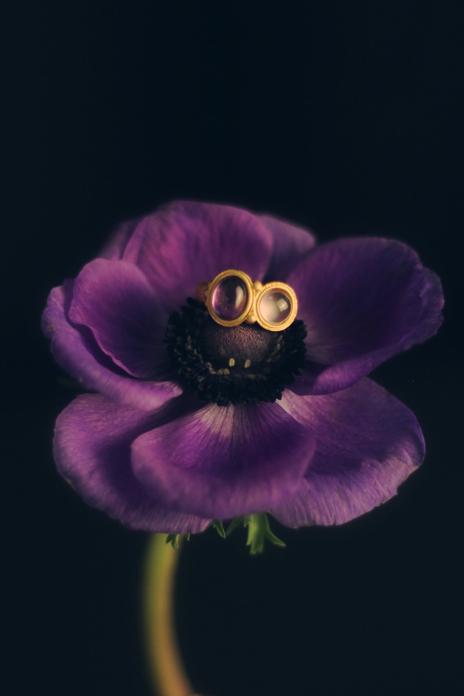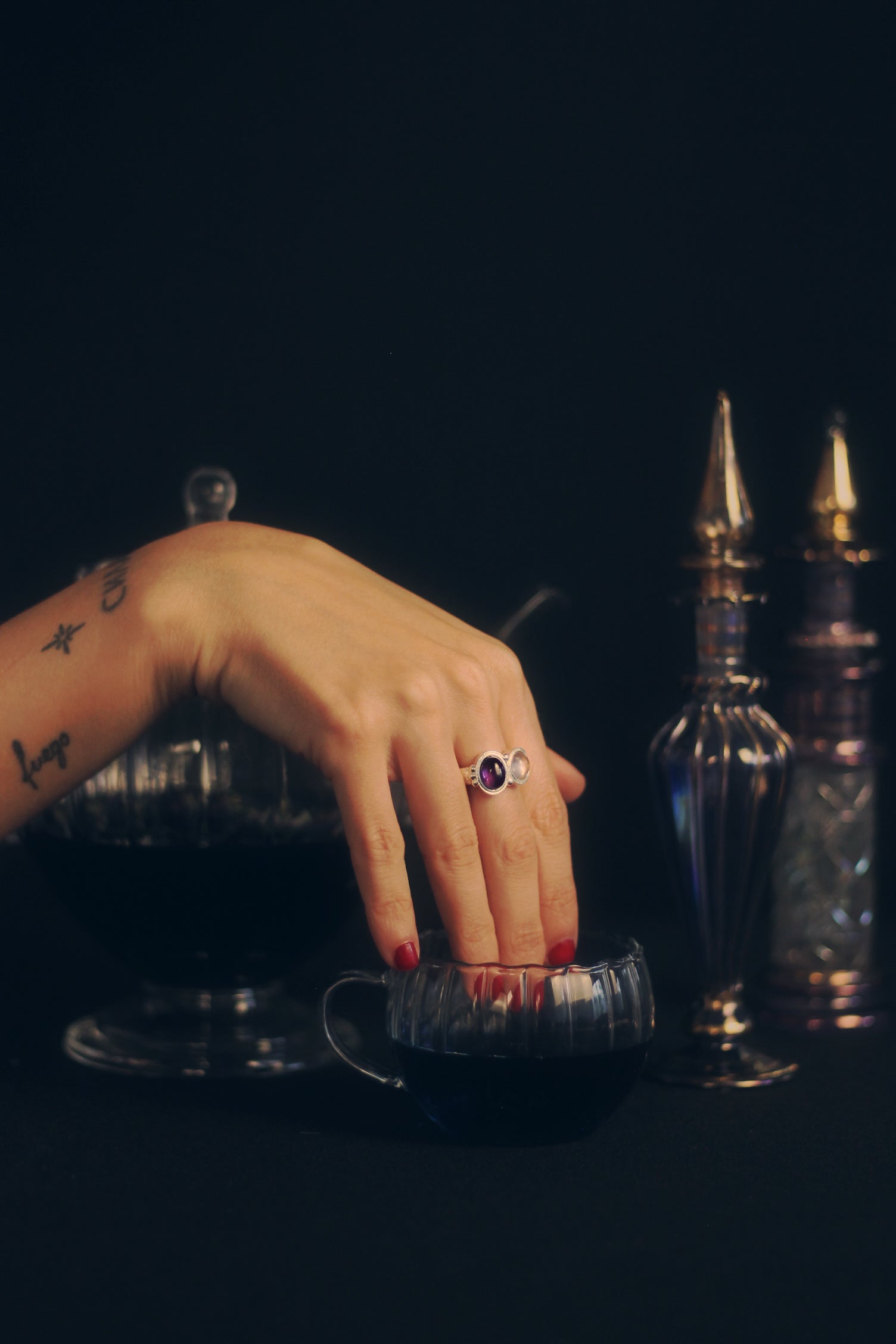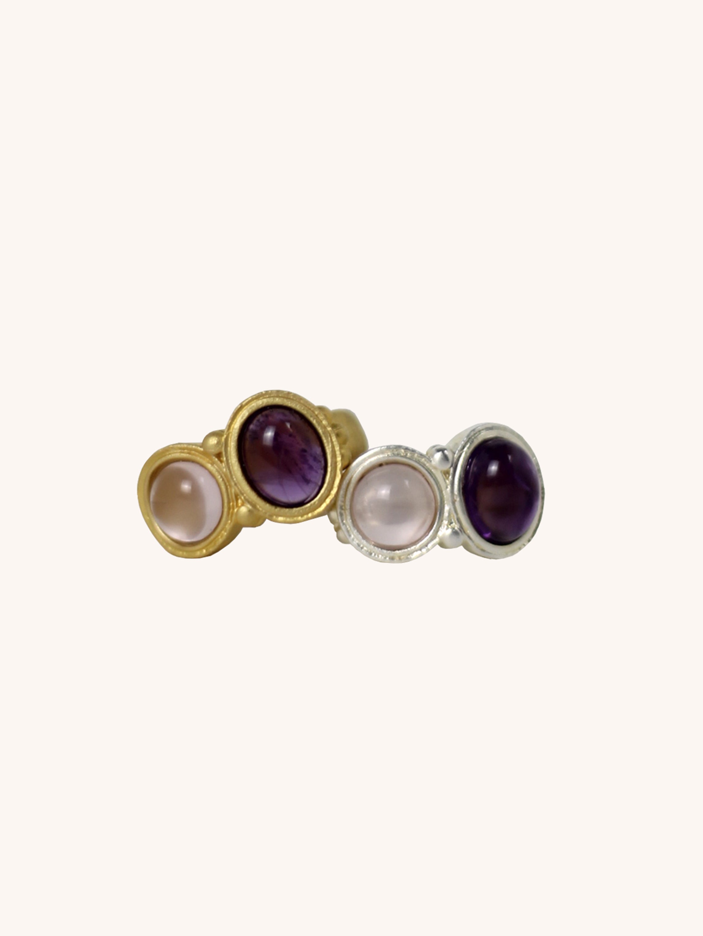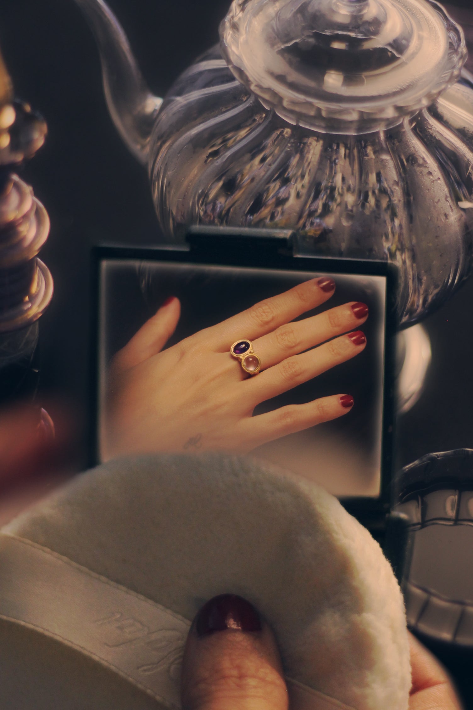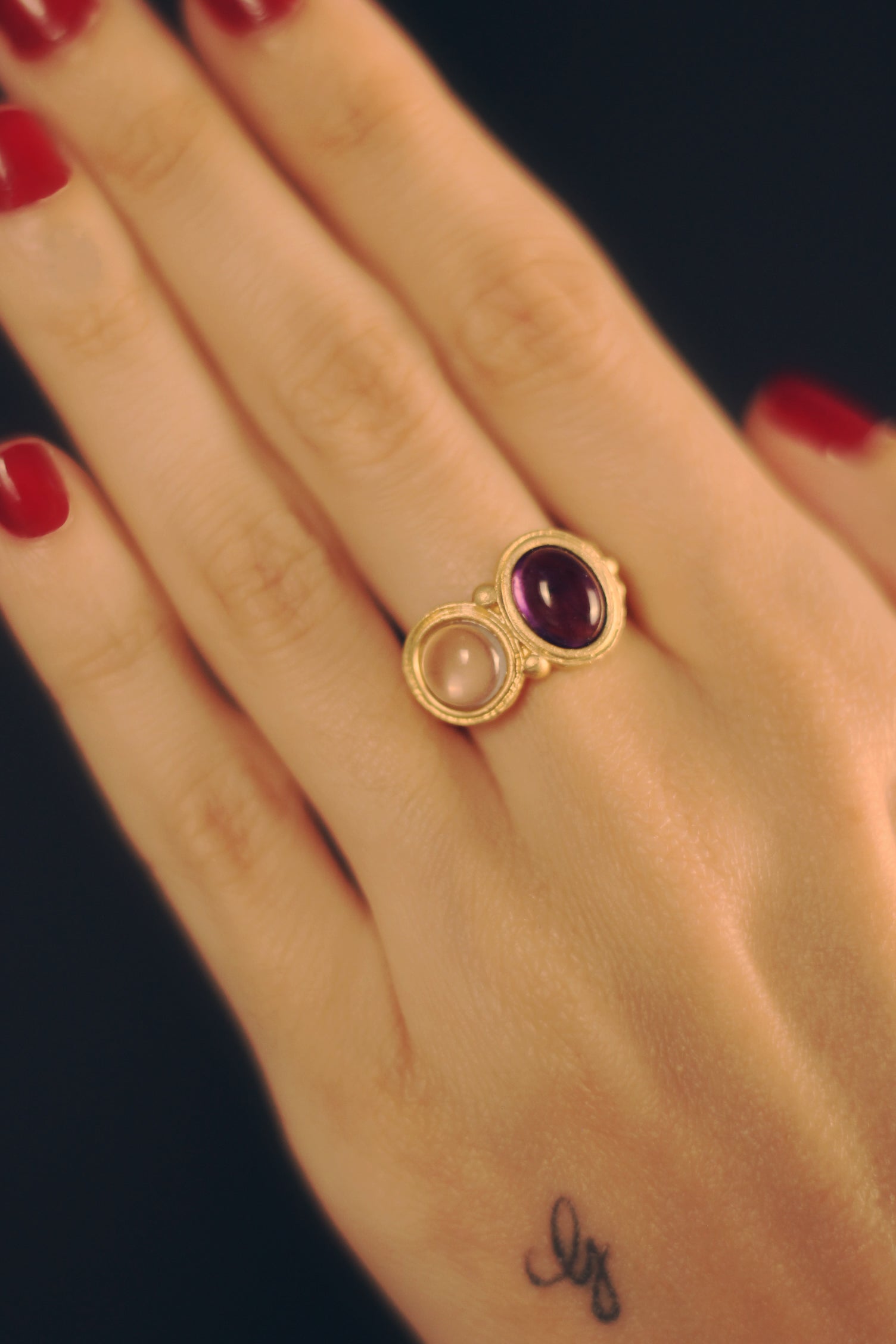 This ring full of symbolism is an amulet that connects with the eternal force of feminine magic. Made with amethyst and rose quartz, two gemstones known for their powerful energies, this ring is a constant reminder of the importance of being present and in harmony with our inner self.